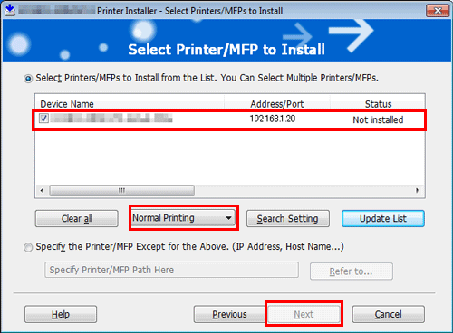 If the connection to this machine cannot be recognized, it is not displayed in the list. In such a case, select [Specify the Printer/MFP Except for the Above. (IP Address, Host Name...)], and manually specify the IP address and host name of this machine.