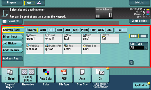 If necessary, you can change the display of the main screen in fax/scan mode (default: [Address Book]). For details, refer to Here.