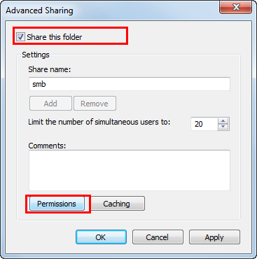 Select the [Share this folder] check box, then click [Permissions].