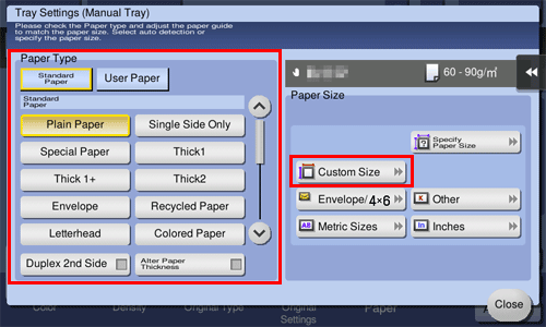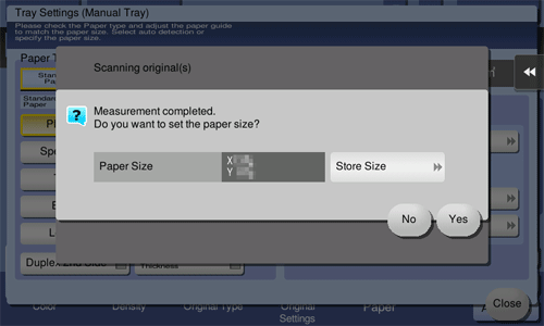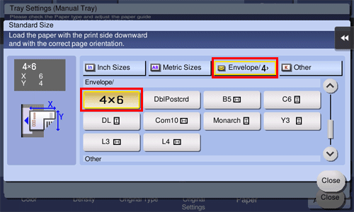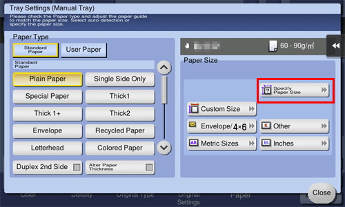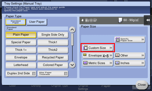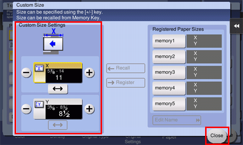 In [Custom Size Settings], specify the paper size by entering values for the lengths along [X] and [Y], then tap [Close].