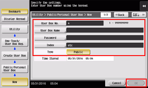 [Type] | Select a User Box type from [Public], [Personal] and [Group] depending on User Authentication or Account Track settings. Only [Public] can be selected if user authentication or account tracking is not enabled. If user authentication is enabled, you can set the owner user by selecting [Personal]. Tap [Change Owner], then select the desired user. If account tracking is enabled, select [Group] to set the owner account. Tap [Change Account Name], then select the desired account. |
