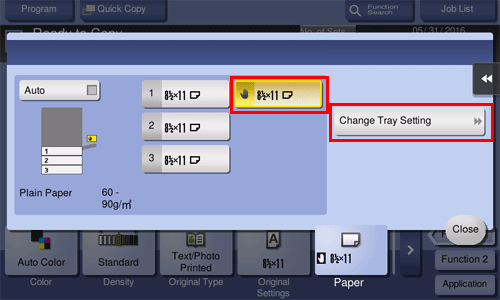 Tap [Paper] and select the bypass tray. Then, tap [Change Tray Setting].