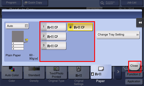 Tap [Paper], select the copy paper to be enlarged or reduced, then tap [Close].