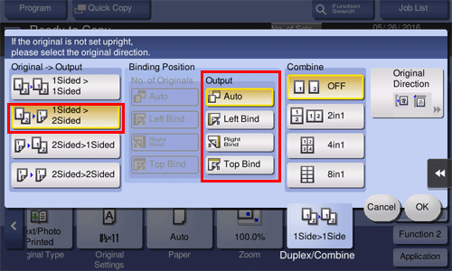 From [Original -> Output], select [1 Sided > 2 Sided], then select a desired bind position for the outputs from [Output].