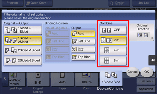 From [Combine], select the number of pages to be copied on the same side of one sheet.