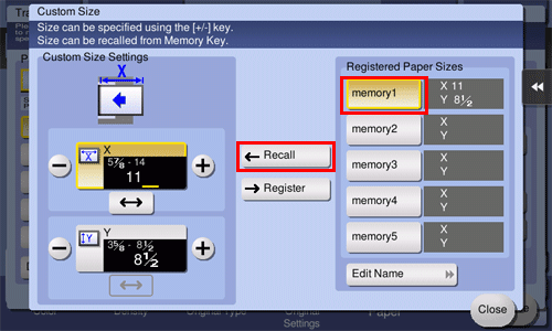 To specify a size registered in the memory, select the desired size from [Registered Paper Sizes], then tap [Recall].