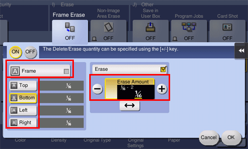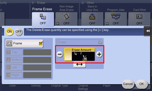 To erase the four sides of the original by the same width, tap [+] and [-] to specify the width to be deleted.