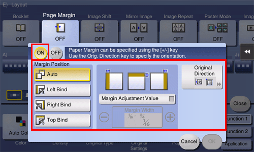 [Margin Position] | Select the position for creating the page margin for binding. When [Auto] is selected, the binding position is automatically set. |