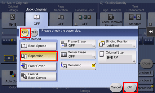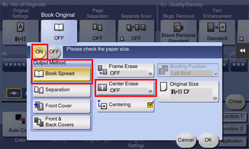 Tap [ON], select [Book Spread], then tap [Center Erase].