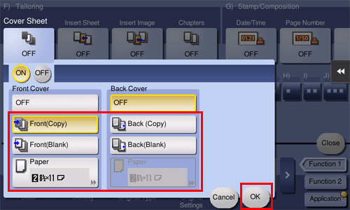 When copying with covers, you can set the page numbers to be printed on the covers using [Insert Sheet Setting].
