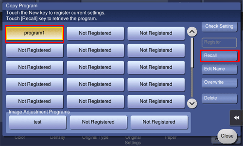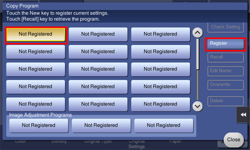 After configuring image quality of the original, density, and other copy settings, tap [Program].