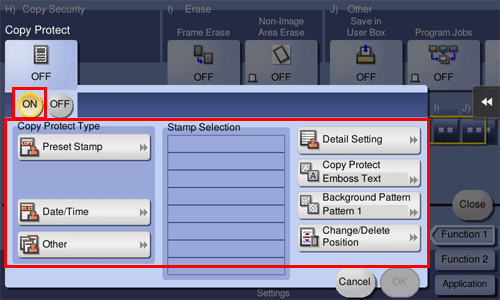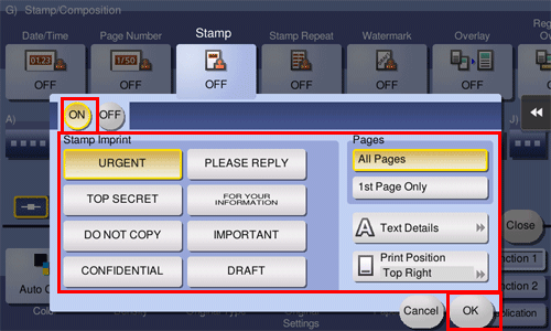Tap [ON], set values for [Stamp Imprint] and [Pages], then tap [OK].