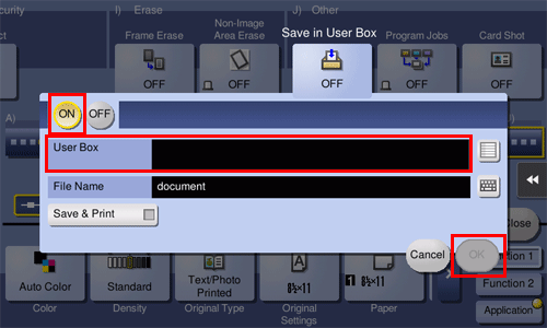 Tap [ON], select a User Box to use for saving in [User Box], then tap [OK].