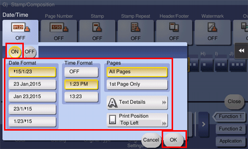 Tap [ON], set values for [Date Format], [Time Format] and [Pages], then tap [OK].