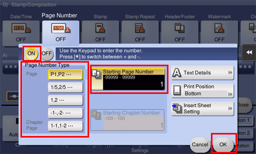 Tap [ON], set values for [Page Number Type] and [Starting Page Number], then tap [OK].