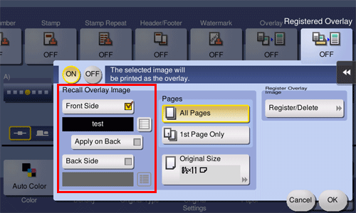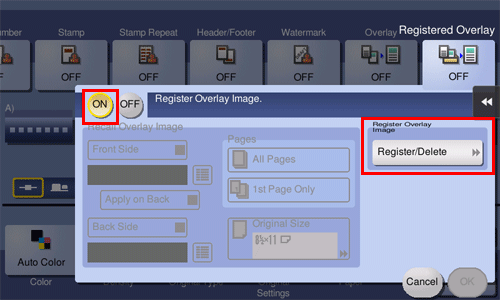 A. Yes. You can register the logos and favorite images in the hard disk of this machine to add such overlay images to copy outputs.