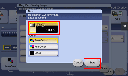 Load the original containing the overlay image to be registered, change image settings as necessary, then tap [Start].