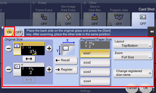 Tap [ON] and enter the width of the fold lines to erase, then tap [OK].