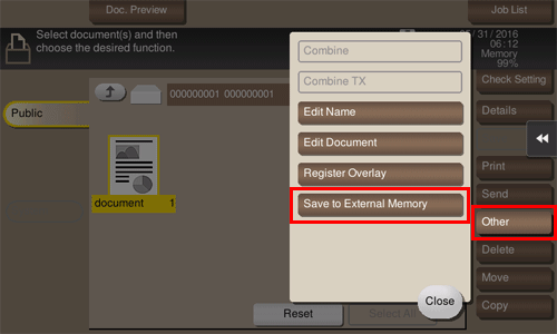 To save a file in an external memory device, select a file to save, tap [Other], then tap [Save to External Memory].