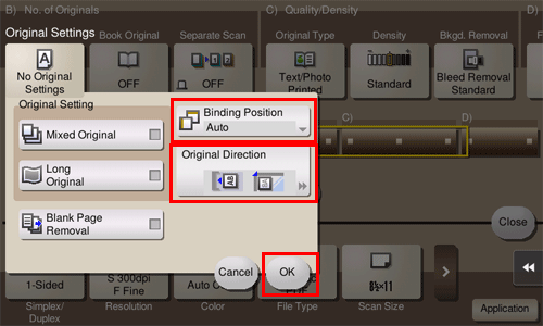Set [Binding Position] and [Original Direction] according to the loaded 2-sided original, then tap [OK].