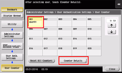 Select [User Authentication/Account Track] - [User Authentication Settings] - [User Counter].