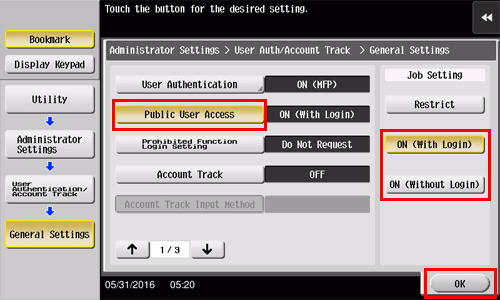 If [ON (With Login)] is selected, the public user can use this machine by selecting [Public User Access] in the login page to log in to the machine.