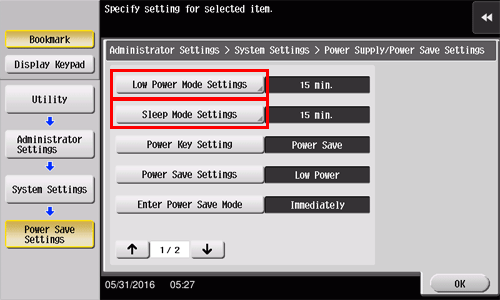 More electric power will be saved in Sleep mode when compared with Low Power mode. However, Sleep mode takes more time to warm up this machine for additional print jobs than Low Power mode. Select the mode appropriate to your application of this machine.