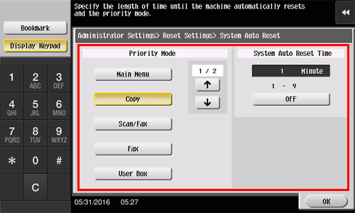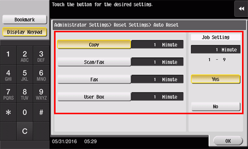 Select functions to display after resetting and enter the time to return to the default settings, using the Keypad.