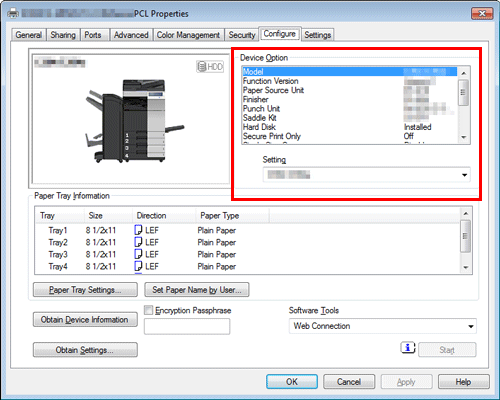 When [Auto] in [Obtain Settings...] is disabled, clicking [Obtain Device Information], obtains and reflects the information on this machine to [Device Option].