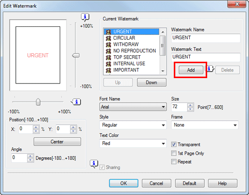 To delete a registered watermark, select the watermark from the [Current Watermark] list, and click [Delete].
