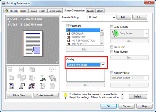 In [Overlay] in the [Stamp/Composition] tab, select [Print Host Image] or [Print Device Image] (PCL only), and then from the list, select the overlay image to be printed on the original as a composite image.
