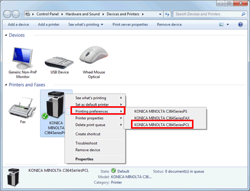 In Windows 7/8/8.1/Server 2008 R2/Server 2012/Server 2012 R2, right-click the icon of the installed printer, and from [Printing Preferences], click the displayed printer name.