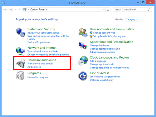 In Windows Server 2012/Server 2012 R2, open the Start window, then click [Control Panel] - [Hardware] - [View devices and printers].
