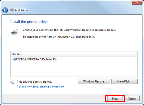 In the [Printer Name or IP Address:] box, enter the IP address for the machine, and then click [Next >].