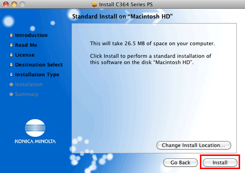 Click [Continue] following the instructions on the pages that follow until the [Install] page appears.