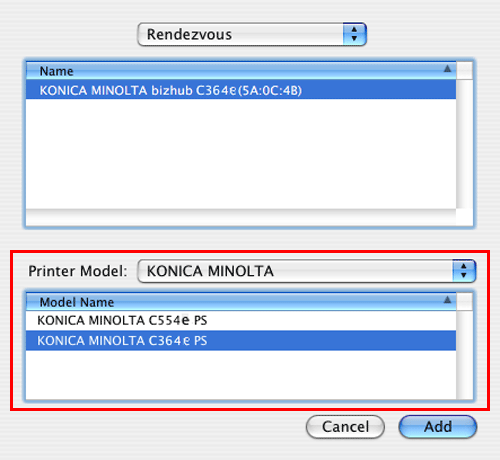Add the printer automatically detected by Rendezvous to the PC.