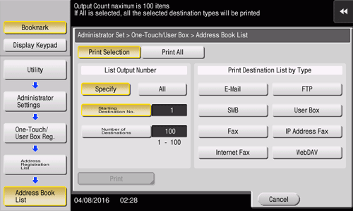 Tap [Utility] - [Administrator Settings] - [One-Touch/User Box Registration] - [One-Touch/User Box Registration List] - [Address Book List].