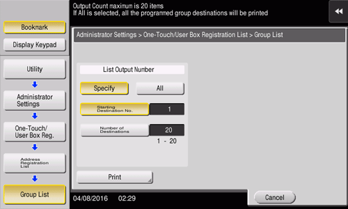 Tap [Utility] - [Administrator Settings] - [One-Touch/User Box Registration] - [One-Touch/User Box Registration List] - [Group List].