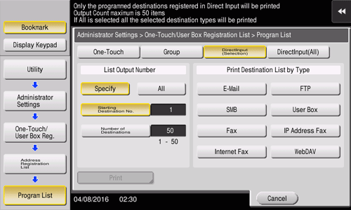 Tap [Utility] - [Administrator Settings] - [One-Touch/User Box Registration] - [One-Touch/User Box Registration List] - [Program List].