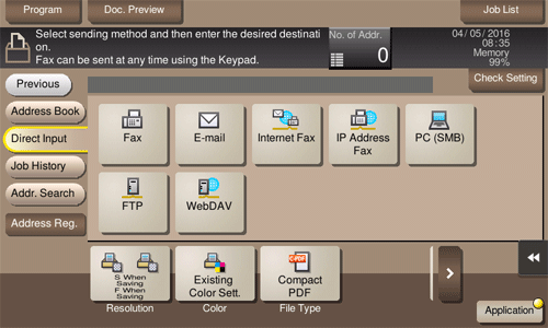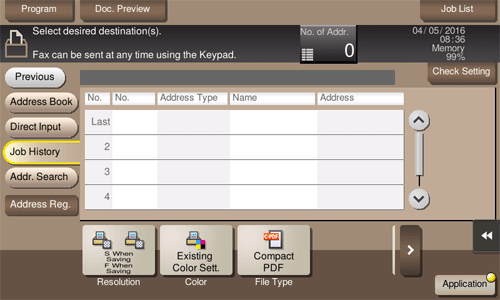 Tap [Job History], and you can select a destination from the scan or fax history.