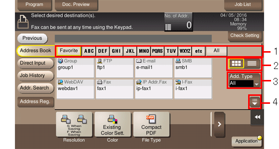 2 | Switches the display of the registered destinations to the button or list view mode. If the list view mode is selected, you can sort destinations by registration number, destination type, or registered name. |