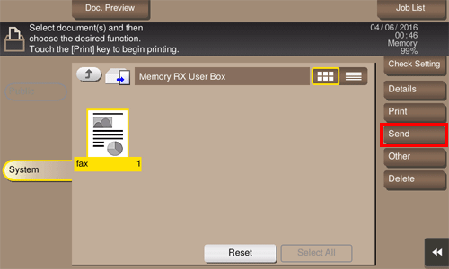 To send a fax saved in the Memory RX User Box, the optional Extension Memory and i-Option LK-110 v2 are required.