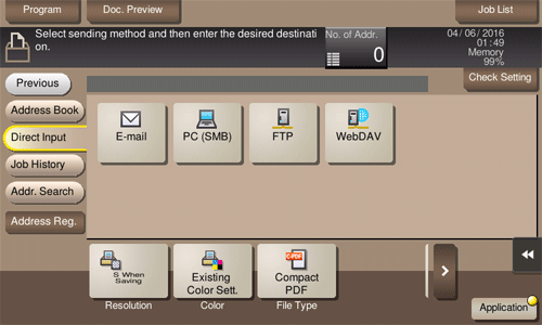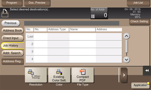 Tap [Job History], and you can select a destination from the scan or saved job history.