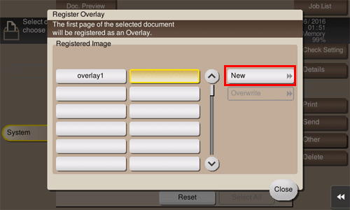 To register an overlay image, select an unregistered key and tap [New].