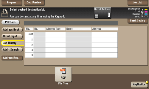 Tap [Job History], and you can select a destination from the scan or saved job history.