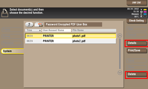 Select a file, then tap [Delete]. The file is deleted. You can select multiple files and delete them simultaneously. Check the file details, then tap [Yes].