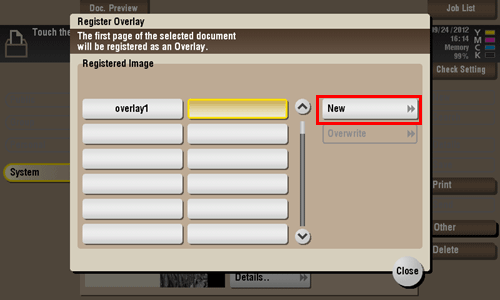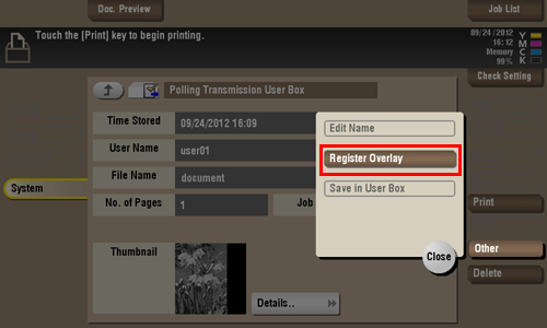 Once registered, you can compose an overlay image on the original during copy or printing from the PC. Also, you can compose an overlay image onto a User Box file during file printing.