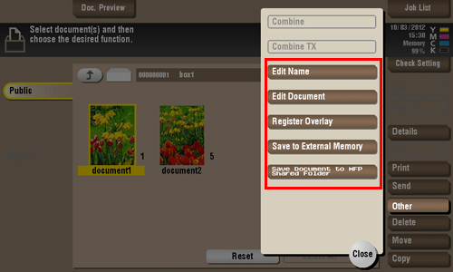 Select a file, then tap [Other] - [Save Document to MFP Shared Folder]. Now you can register files saved in the Public User Box in an SMB sharing folder.