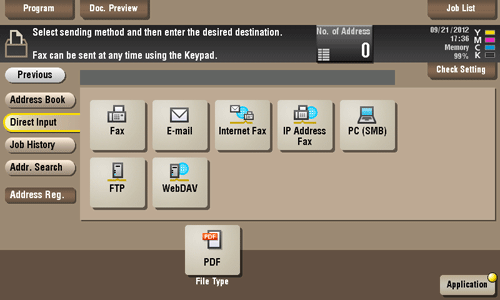 Tap [Job History], and you can select a destination from the scan or saved job history.