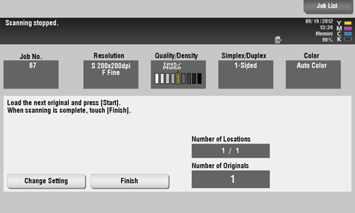 6. After all originals are scanned, tap [Finish] and press the Start key.